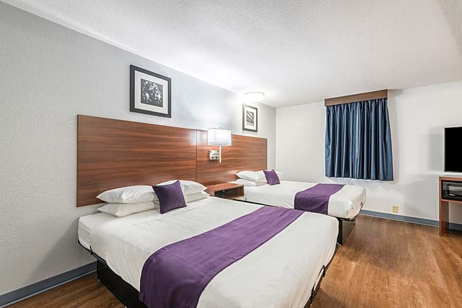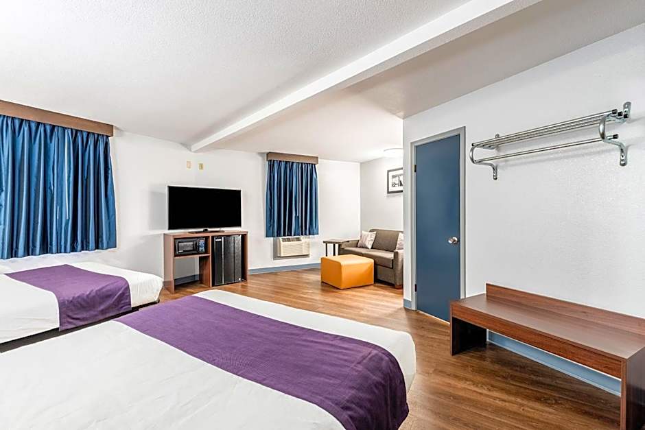 A cable TV, a microwave, and a compact refrigerator are offered in this room.